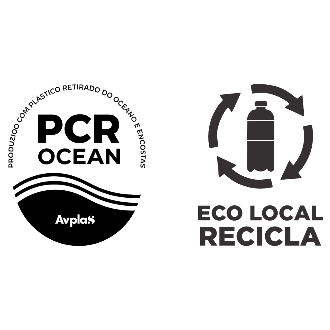 Disponível para clientes que adquirem embalagens com plástico PCR Ocean, coletado em praias e encostas do Brasil em parceria com a ONG Eco Local Brasil.